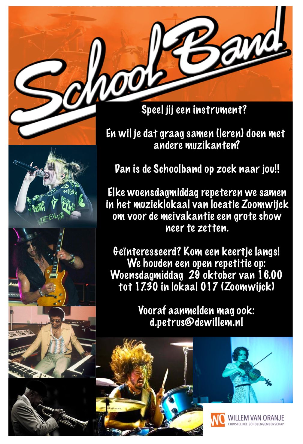 Na de herfstvakantie gaat de Schoolband weer beginnen. Dat doen ze op woensdag 29 oktober met een open repetitie. Dus speel jij een instrument en vind je het leuk om met andere muzikanten een band te vormen? Ga dan zeker kijken. Je bent welkom vanaf 16.00 uur in lokaal 017.