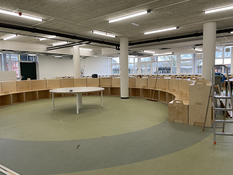 Een grote aanwinst is eveneens het Atelier. Op de plek van drie kunstlokalen is nu één grote werkruimte gemaakt waar drie klassen tegelijkertijd aan de slag kunnen en elkaar inspireren. Grote houten kubussen in het midden vormen een grote zitbank. Binnenkort wordt het Atelier in gebruik genomen door de leerlingen.